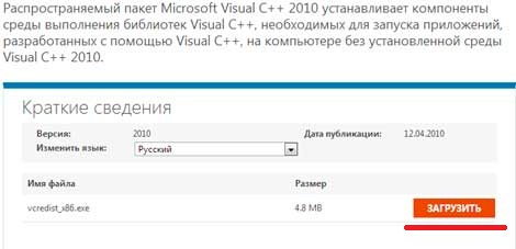 качаем библиотеки с сайта Microsoft по ссылке http://www.microsoft.com/ru-ru/download/details.aspx?id=5555 Нажимаем «загрузить»