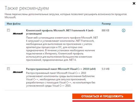 На страничке «Также рекомендуем» не ставим галочек. Жмем «Отказаться и продолжить».