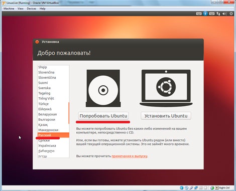 Первым окошком у нас будет выбор языка, находим «русский», нажимаем «Попробовать Ubuntu».