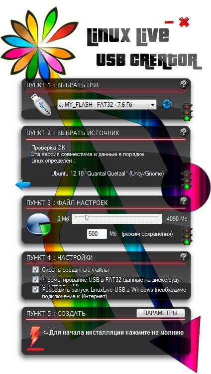 В настройках рекомендую поставить все галочки, ваша флешка будет отформатирована в Fat32, созданные файлы буду скрыты.