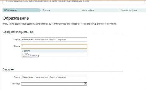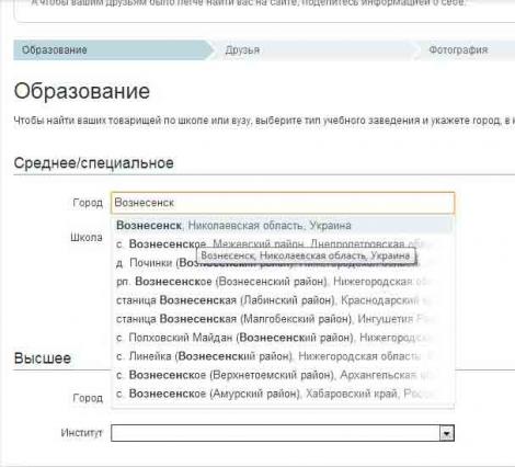 В поле Среднее/специальное в строчке Город, стираем то, что написано и печатаем наш город. По ходу как мы печатаем высветиться список, с указанием района, области, выбираете ваш.